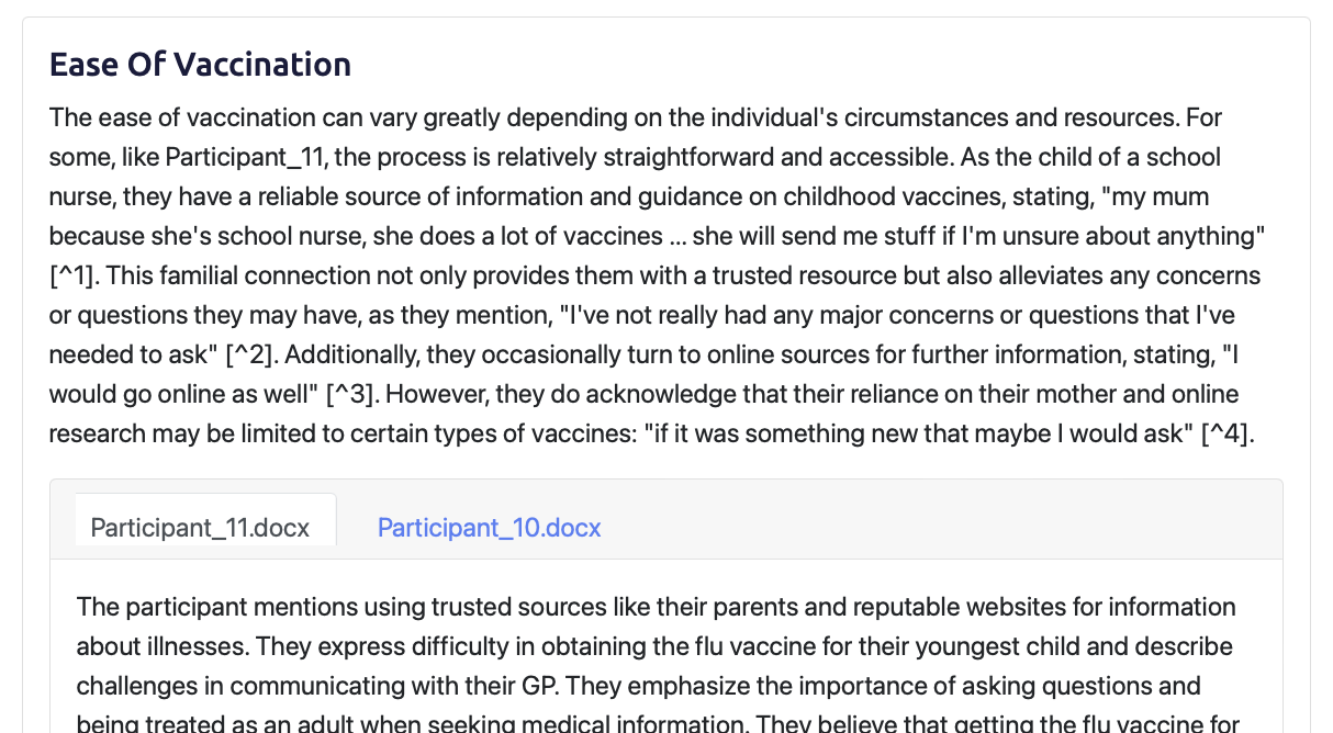 Get more detailed and nuanced thematic analyses, comprehensive list of supporting quotes, frequency analysis, and more! Up to 15 documents.